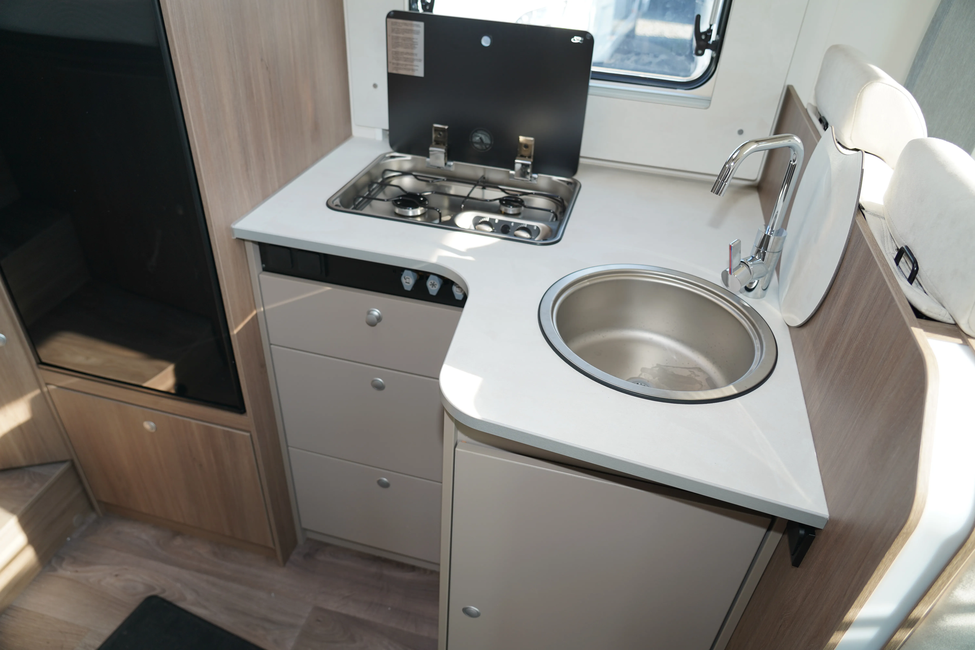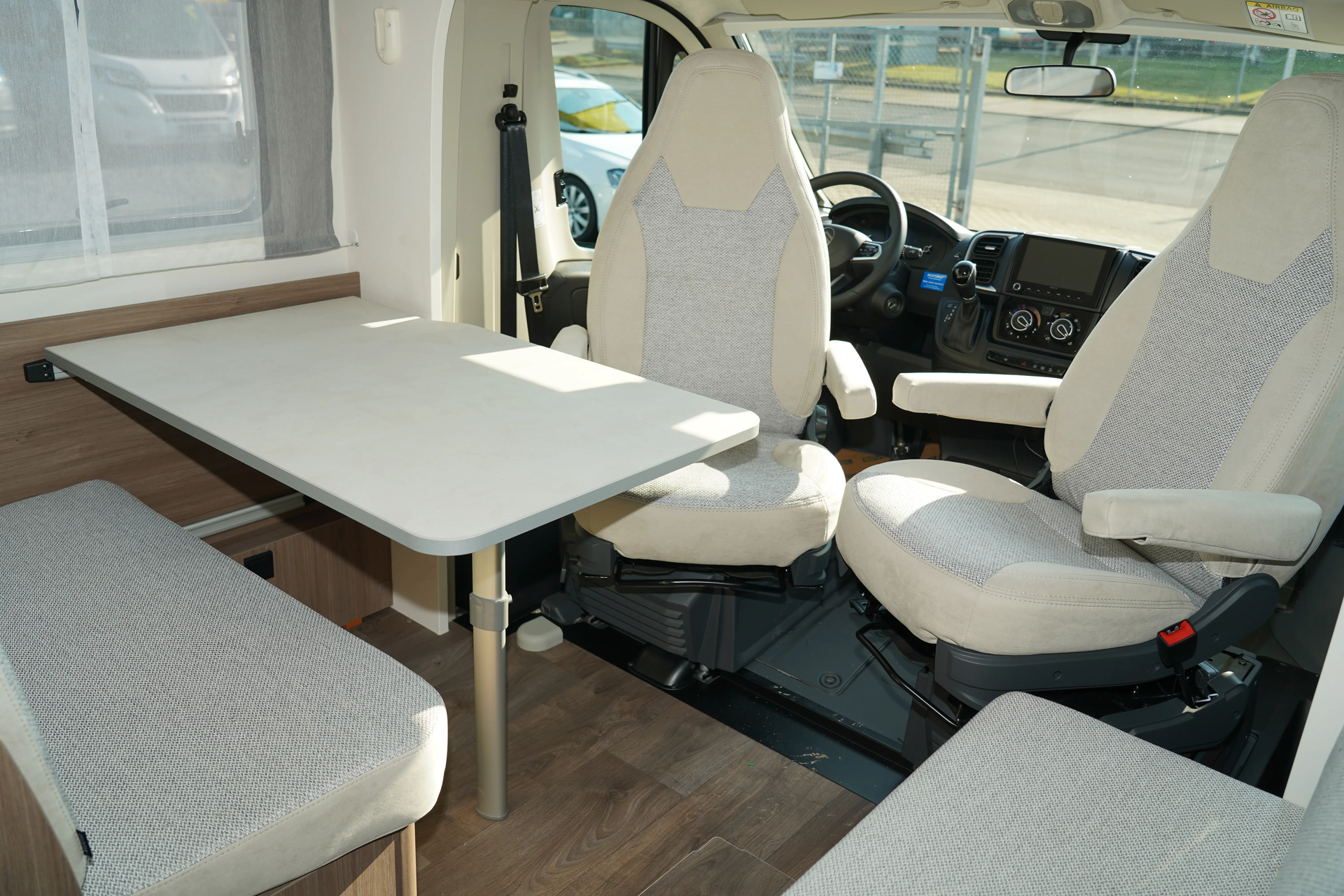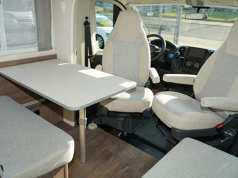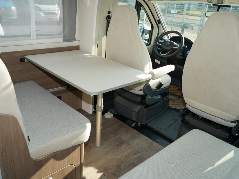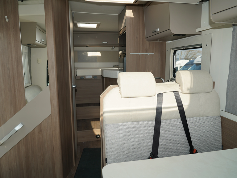 - Fünfter Sitzplatz auf Seitensitzbank mit Sicherheitsgurt (entgegen der Fahrtrichtung)
