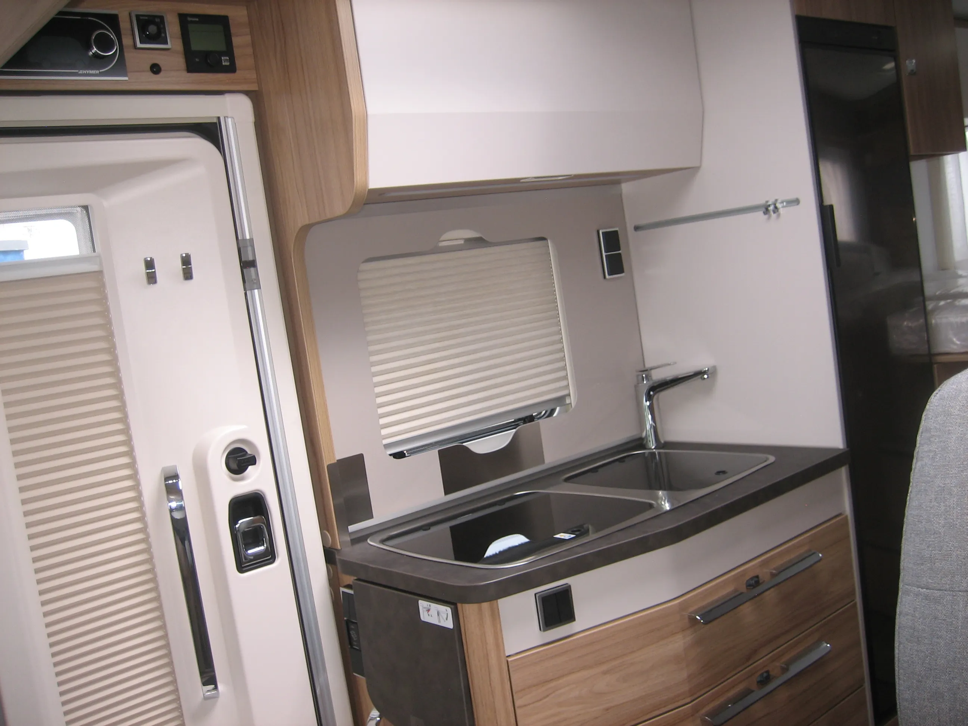 - Komfort-Eingangstür mit Fenster, Verdunkelungsrollo, integriertem Mülleimer und 2-fach Verriegelung