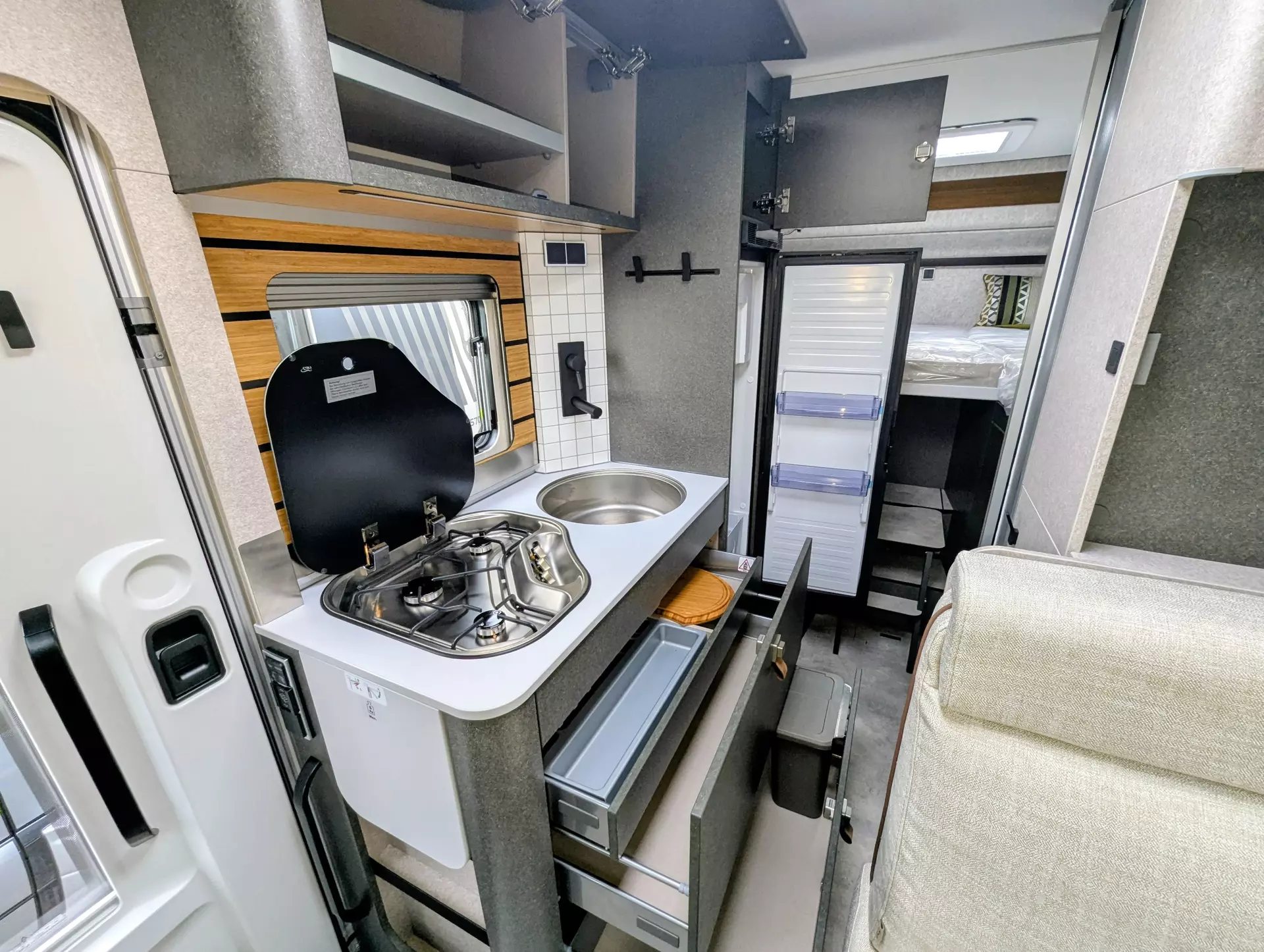 - Komfort-Eingangstür mit Fenster, Verdunkelungsrollo, integriertem Mülleimer und 2-fach Verriegelung