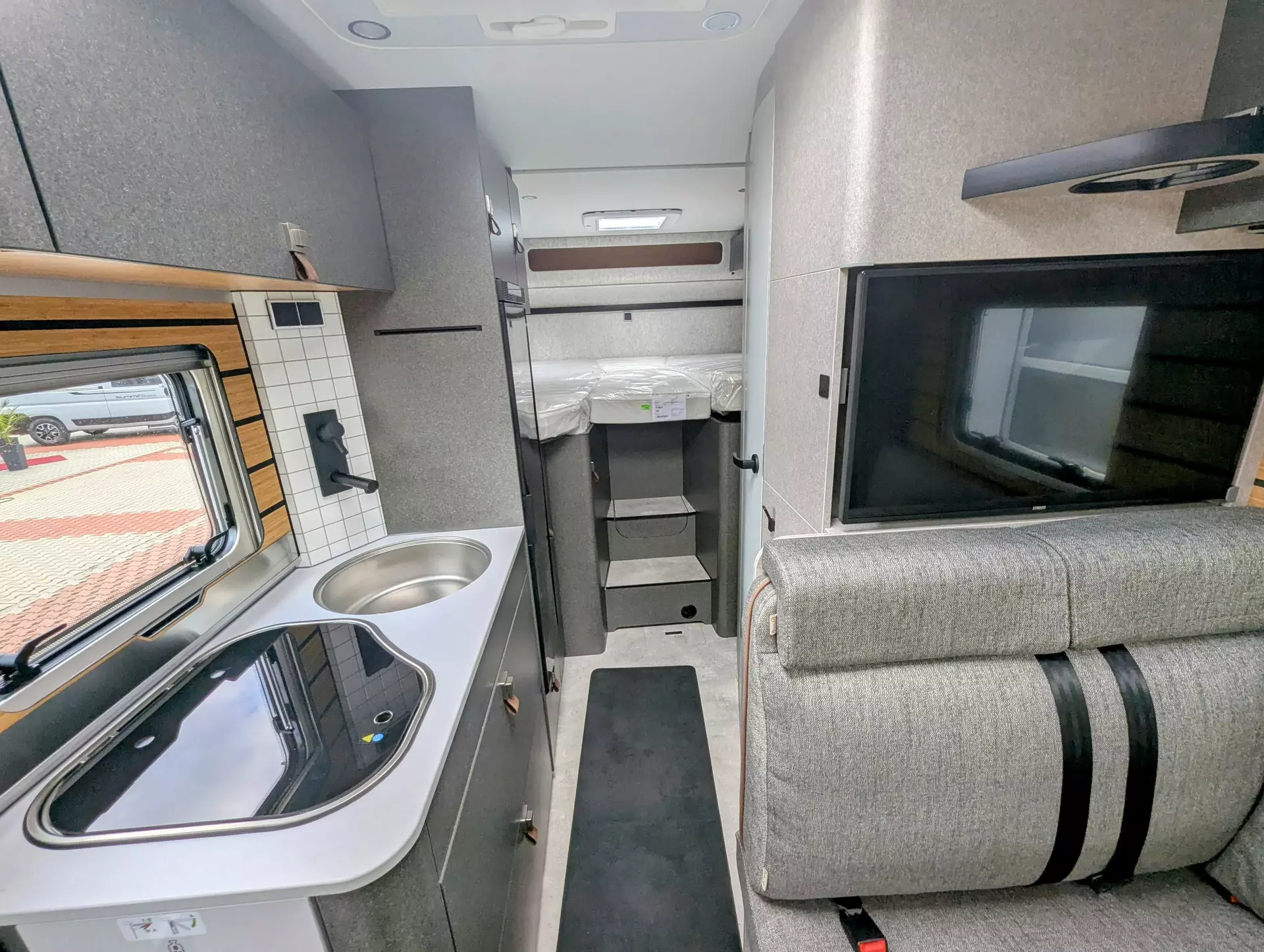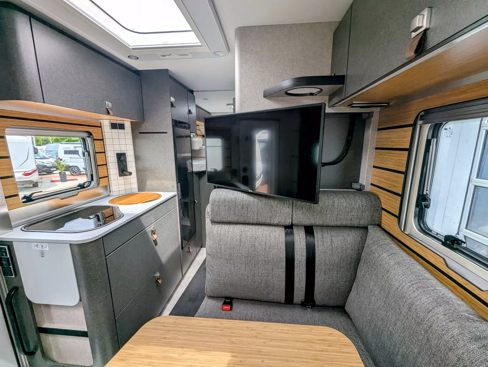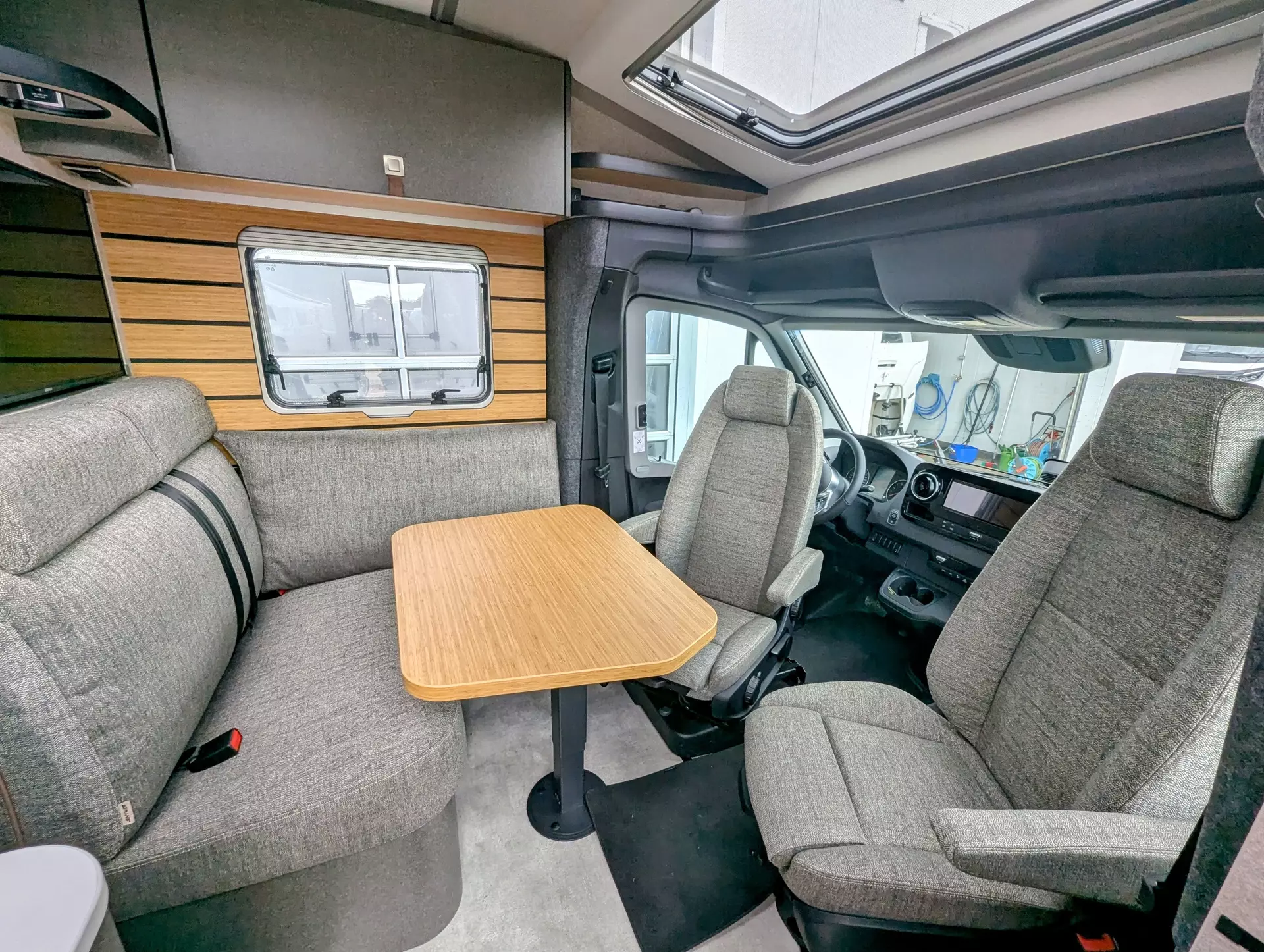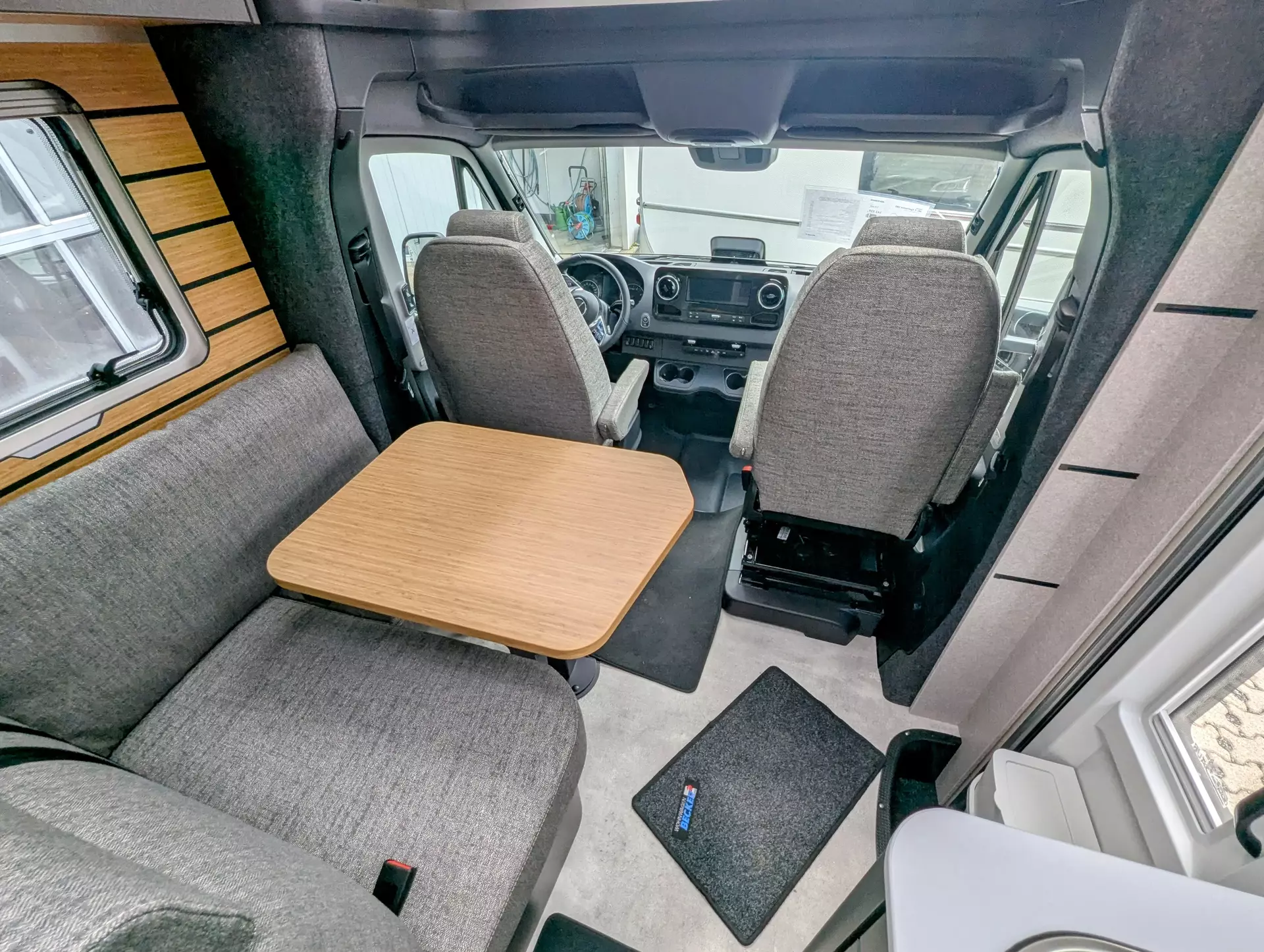 - Bettenbau für Komfort L-Sitzgruppe inkl. Zusatzpolster und absenkbarem Tisch unter Einbeziehung des Fahrersitzes
